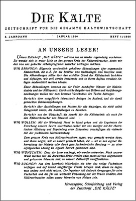 Die erste Ausgabe der Fachzeitschrift Die Kälte“ mit dem Untertitel Lieferwerk für Kälteforschung – Kältetechnik und Kältewirtschaft“ erschien im Jahr 1948. Der damalige Herausgeber war der Hans A. Keune-Verlag in Hamburg. Wie aus dem Impressum zu entnehmen ist, startete man bei dem reinen Vertriebsobjekt mit Veröffentlichungen in zwangloser Folge“, was man dadurch kompensierte, dass es auch Doppelausgaben gab. Nach dem Zerwürfnis mit dem ersten Herausgeber, Prof. Rudolf Plank, wurde 1949 der Untertitel vereinfacht und lautete Zeitschrift für die gesamte Kältewirtschaft“. Was den Inhalt angeht, so widmete man sich, wie der neue Titel dokumentierte, nicht nur technischen Themen. So berichtete die erste Ausgabe 1949 (Umfang: 22 Seiten) beispielsweise über Folgendes:
