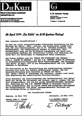 Zwei Monate später wurde mit Günter K. Wisniewsky schließlich sein Nachfolger vorgestellt. Ein knappes Jahr danach fiel schließlich der Startschuss für eine neue Ära der Zeitschrift Die Kälte“. In der März-Ausgabe 1974 wurde den Lesern und Geschäftsfreunden mitgeteilt, dass die Herausgeberschaft auf den A.W. Gentner Verlag übertragen wird. Der Wechsel wurde damit begründet, dass der A.W. Gentner Verlag über das notwendige Netzwerk verfügt, um Die Kälte“ auch international zu etablieren bzw. weil auch größere redaktionelle Kapazitäten zur Verfügung standen. Ein weiteres Argument war sicher auch die Tatsache, dass im Gentner Verlag zum damaligen Zeitpunkt bereits haustechnische Fachzeitschriften erschienen (SBZ, SBZ Monteur, Glaswelt, Öl- und Gasfeuerung, Fahrzeug + Karosserie). Der Bereich Kälte und Klima war aber noch unbesetzt und so kam es zu der Übernahme. Dies wurde dem Leser schon mit der nächsten Ausgabe deutlich, da diese, sowohl was die Titelseite als auch den Umbruch und die Gestaltung der Beiträge anbelangt, komplett überarbeitet und in das CI des Gentner Verlags eingefügt wurde. Ein Wandel, den Hauptschriftleiter Wisniewsky bereits in der Dezember-Ausgabe 1973 andeutete, indem er in seinem Weihnachtsgruß auf die Leserwünsche im Hinblick auf ein neues Gewand der Kälte“ einging. In einem Wort in eigener Sache“ des Heftes 4/74 hieß es unter anderem: