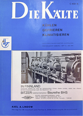 Die Farbe betraf dann auch die erste offensichtliche Neuerung der Kälte“ im neuen Jahrzehnt. Denn war die Titelseite bis zum damaligen Zeitpunkt noch in einem schlichten Grauton gestaltet, setzte man ab dem Heft 1/1970 auf einen blauen Einband. Außerdem wurde der Untertitel neutralisiert, indem man Technisch-wirtschaftliches Fachorgan für die gesamte Kältewirtschaft Klimatechnik und den Kühlgüterverkehr“ einfach in Kühlen – Gefrieren – Klimatisieren“ umbenannte. Außer dieser äußerlichen Veränderung spielten sich Anfang der 1970er-Jahre allerdings weitaus gravierendere Veränderungen hinter den Kulissen der Fachzeitschrift Die Kälte“ ab. Mit der November-Ausgabe 1970 wurde neben dem Herausgeber und auch Verantwortlichen für den Inhalt, Axel Lindow, erstmals mit Dipl.-Ing. Otto Lang ofziell ein Hauptschriftleiter benannt. Der war allerdings kein Neueinsteiger“ und hatte sich schon seit Jahren als Autor von zahlreichen Beiträgen für Die Kälte“ einen Namen gemacht. Weshalb es zu dieser personellen Veränderung kam, zeigte sich schon nach sehr kurzer Zeit, denn nur einen Monat später wurden die Kälte“-Leser in einer Meldung in eigener Sache über den Tod von Axel Lindow in Kenntnis gesetzt.