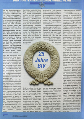 Die berufliche Praxis wurde relativ rasch in die BIV-Rubrik der KK aufgenommen und auch permanent mit aktuellen Informationen über den Verband, aus den Innungen sowie über das Ausbildungswesen über verbandspolitische Themen und sogar durch Firmenreportagen über repräsentative Mitgliedsbetriebe versorgt. Dies führte schließlich dazu, dass ab dem Heft 5/84 das Impressum um die beiden neuen Mitarbeiter Peter Weissenborn und Manfred Meyer als zuständige Redakteure für Informationen den BIV-Kälteanlagenbauer betreffend ergänzt wurde. Von diesem Zeitpunkt an begann sich die KK von einem bis dahin technisch-wissenschaftlichen Magazin zu einer beruflich praxisorientierten Fachzeitschrift zu entwickeln. Der Anteil der Rubrik BIV-Kälteanlagenbauer“ machte zeitweise die Hälfte des Heftumfangs aus, wodurch die KK Mitte der 80er-Jahre eine Mischung aus Planerzeitschrift mit Fachbeiträgen über Ventilatorentechnologien, Luftfilter, Büroklimatisierung, kältetechnische Komponenten und Systeme, Regelungsvarianten und Kältemittel sowie Handwerkermagazin mit Beiträgen aus den Innungen, über Mitglieder, die Berufsausbildung sowie zum Verbandsgeschehen war, dies ergänzt durch zahlreiche Berichte über Messen und Fachveranstaltungen – der DKV feierte 1984 beispielsweise in Baden-Baden sein 75-jähriges Jubiläum – aus dem In- und Ausland sowie bereits erwähnt durch regelmäßige Firmenreportagen. lm gleichen Jahr wie das DKV-Jubiläum wurde auch der Grundstein für den Neubau der Bundesfachschule Kälte- und Klimatechnik in Maintal gelegt, der Ausbildungsstätte der Landesinnung Hessen für die berufliche Aus-, Fort- und Weiterbildung im Kälteanlagenbauerhandwerk, die sich zur bedeutendsten in Deutschland entwickeln sollte.