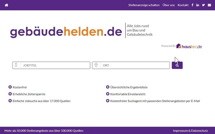 Dazu arbeitet das Portal mit einer speziell entwickelten, auf die Branche zugeschnittenen Spider-Technologie. Auf dieser Basis durchsucht Gebäudehelden.de ständig mehr als 100.000 Einzelquellen nach branchenrelevanten Stellenangeboten im Netz: Homepages von Unternehmen, allgemeine Jobbörsen und Spezialanbieter, Personaldienstleister, Tageszeitungen, Kleinanzeigen-Portale, Baufachmedien und die Bundesagentur für Arbeit. All diese Angebote erfasst das neue Portal und filtert sie nach den Vorgaben des Suchenden.