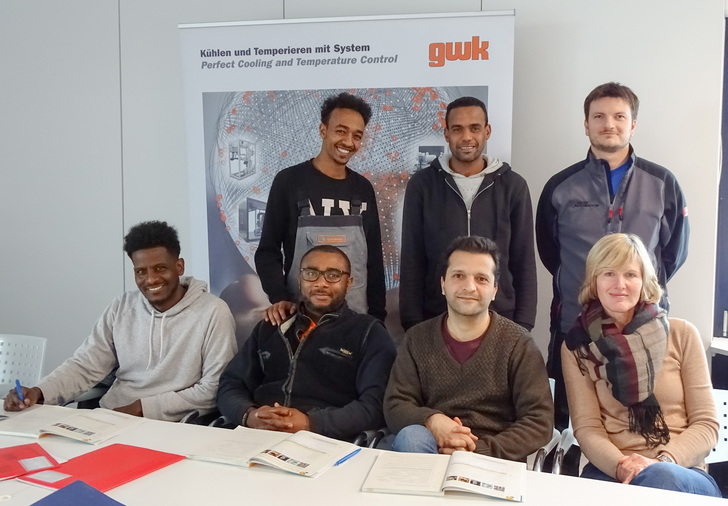 Wenn zweimal wöchentlich der Deutschkurs bei der gwk beginnt, kommen Menschen aus mehreren Kontinenten und ganz unterschiedlichen Berufszweigen zusammen. Die Schüler stammen etwa aus dem Iran, Nigeria, Eritrea, Ägypten oder Kroatien. Teilweise bringen sie fundierte Ausbildungen bis hin zum abgeschlossenen Maschinenbaustudium mit. Derzeit leben sie im Schnitt seit zwei bis drei Jahren in Deutschland. Bei ihrer Einreise mussten die meisten von ihnen die Grundzüge der Sprache erst erwerben. Alle setzen sich mit vollem Engagement in ihren Arbeitsbereichen bei der gwk ein: in der Schweißerei, der Endabnahme oder dem Lager. Zwei der jungen Männer absolvieren eine Ausbildung zum Industrieelektriker. Die sprachlichen Fähigkeiten, die ihnen noch fehlen, erarbeiten sie sich nun gemeinsam mit einer Deutschlehrerin aus einem Sprachenzentrum vor Ort, die extra ins Unternehmen kommt.