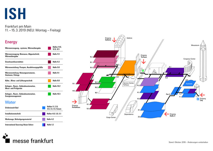 Der Bereich der Kälte-, Klima- und Lüftungstechnik – erstmals in der ehemaligen Heizungshalle 8 – präsentiert sich 2019 facettenreicher und größer denn je. Hier stehen unter anderem moderne Gebäudelüftungssysteme mit dem Thema Indoor Air Quality (IAQ) sowie zentrale und dezentrale Lösungen für Neubau und Sanierung im Fokus. Energieeffizienz, behagliches Raumklima, der F-Gase-Phase-Down und die damit einhergehende Verknappung von Kältemittel sowie die Entwicklung von Alternativen werden ebenso diskutiert wie die technischen Herausforderungen der Branche. Die Präsentation der gewerkeübergreifenden Kompetenz im Einklang mit innovativer Gebäudeautomation auf der ISH leistet für integrale Planungs- und Ausführungsprozesse einen wichtigen Beitrag. Im Zuge der allumfassenden Digitalisierung ist das Internet of Things (IoT) in Verbindung mit Building Information Modeling (BIM) auch ein stetig wachsendes Segment und ein wichtiger Baustein für Smart Buildings.