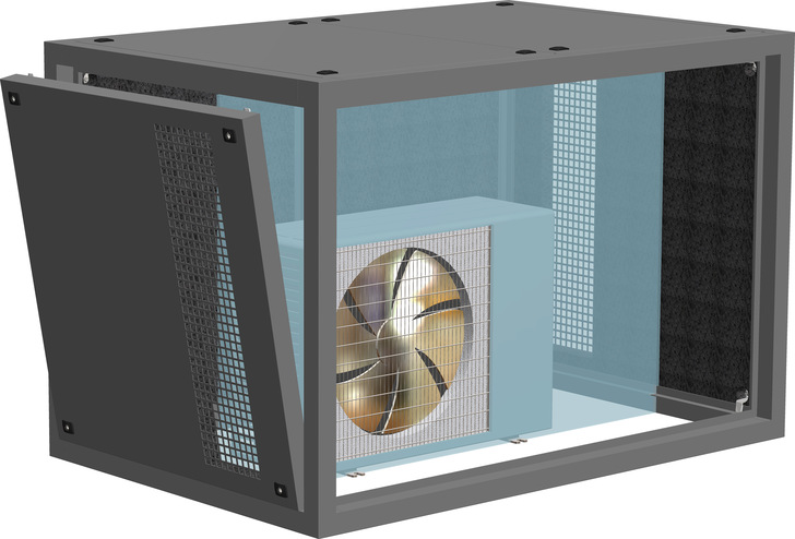 Der Grundrahmen besteht aus Aluminiumprofilen, die mit Spezialecken zusammengesteckt sind. Hier werden allseitig Aluminiumtüren eingesetzt. Sie weisen innen eine 40 mm starke Schalldämmung auf. Die Türen nehmen die komplette Bauhöhe und Baubreite ein. Daher erlauben sie den raschen und ungehinderten Zugang von allen Seiten für die Wartungsarbeiten.