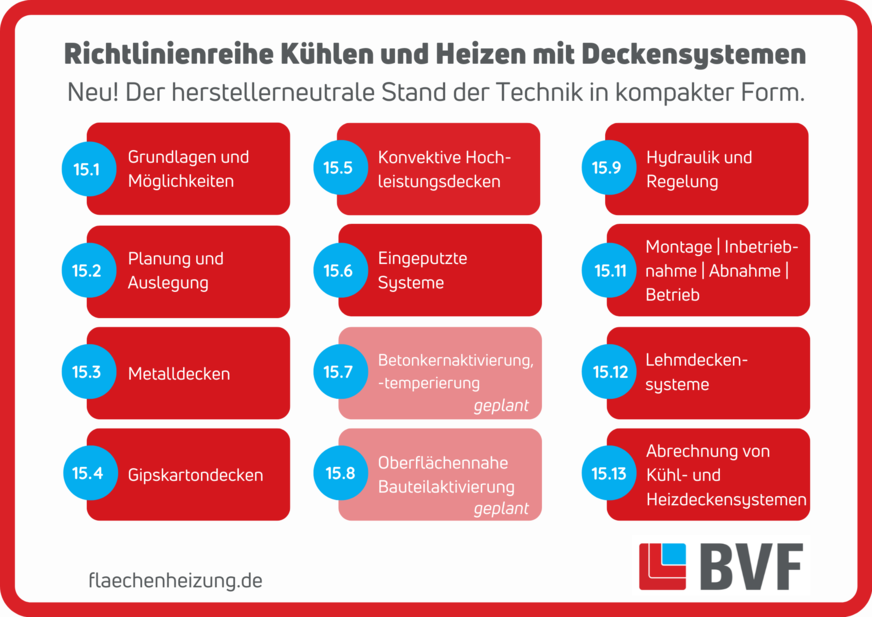 Der Bundesverband Flächenheizungen und Flächenkühlungen e.V. (BVF) hat die Richtlinie 15.13 für die Abrechnung von Kühl- und Heizdeckensystemen herausgegeben. Bisher gab es dafür keine spezielle Abrechnungsnorm. Daher werden zur Zeit die bestehenden ATV DIN Normen 18340 (Trockenbauarbeiten), 18350 (Putz- und Stuckarbeiten) sowie 18380 (Heizanlagen) herangezogen. Mit der Richtlinie möchte der BVF den Planern, Verarbeitern und der Industrie einen praxisorientierten Leitfaden an die Hand geben.