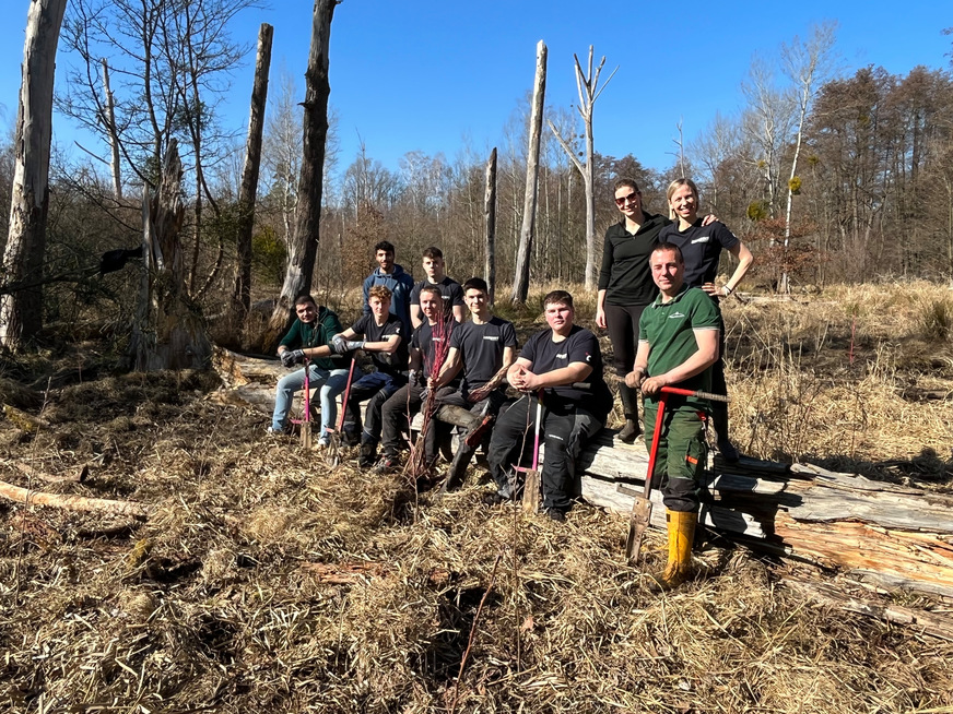 Die Auszubildenden des ersten und zweiten Lehrjahres zeigten dabei nicht nur vollen Einsatz, sondern auch kreativen Teamgeist: Mit pink markierten Setzlingen, farblich abgestimmten Handschuhen und Werkzeugen war ihr Beitrag zur Aufforstung nicht zu übersehen – und ein klares Statement für ein verantwortungsbewusstes Miteinander.
