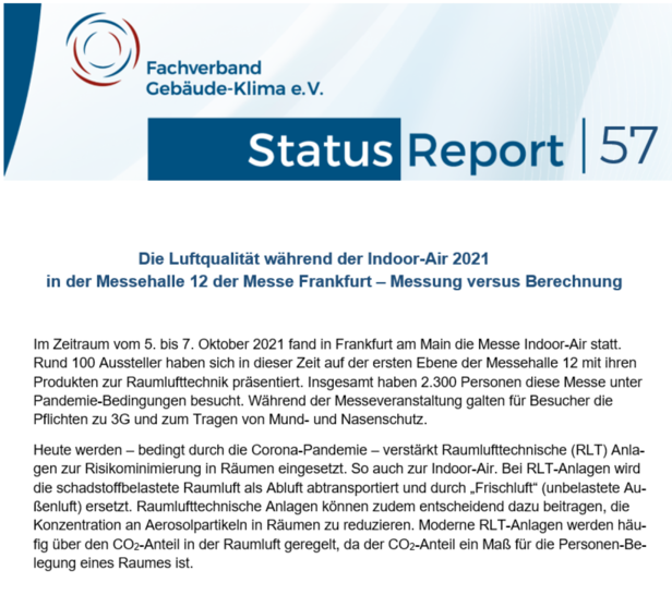 Bei rund 1000 Besuchern pro Tag, einer geschätzten Zahl von etwa 500 Personen als Standbesetzung und einer angenommenen CO2-Produktion von 18 l/h pro Person ergibt sich rechnerisch eine CO2-Konzentration von 453 ppm. Hätten 5.600 Personen – die unter Pandemiebedingungen maximal zulässige Zahl – die Messe gleichzeitig besucht, hätte der 3,7-fache Luftwechsel die CO2-Konzentration auf 570 ppm begrenzt. Es wäre auch in diesem Fall die Kategorie I nach DIN EN 16798-1 eingehalten worden. Ohne Lüftung wäre der Wert im Verlauf des Messetages auf fast 4.000 ppm angestiegen.Der FGK Status-Report 57 „Die Luftqualität während der Indoor-Air 2021 in der Messehalle 12 der Messe Frankfurt – Messung versus Berechnung“ steht zum Download auf www.fgk.de im Menüpunkt Dokumente/Literatur. (OB)