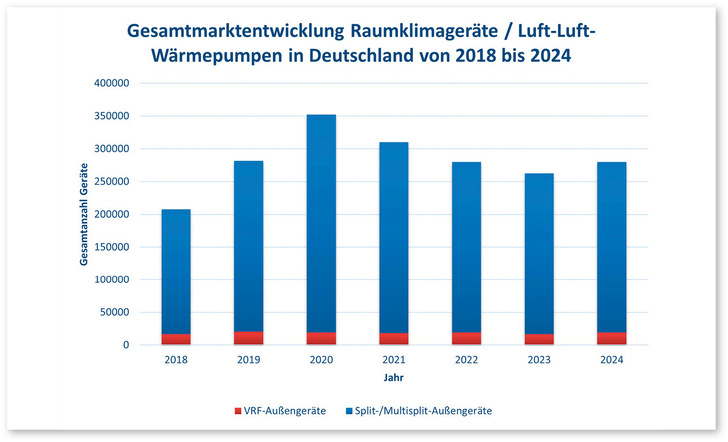 Eine Markterhebung des Fachverbands Gebäude-Klima zeigt die Entwicklung der Verkaufszahlen von Luft-Luft-Wärmepumpen in Deutschland. Nach einem Rückgang bis 2023 steigen die Absatzzahlen für Split-, Multi-Split- und VRF-Systeme seit 2024 wieder an. Der Fachverband Gebäude-Klima (FGK) erfasst quartalsweise die Verkaufszahlen von Außeneinheiten für DX-Raumklimageräte mit Wärmepumpenfunktion. Die Erhebung umfasst Außenluft-Raumluft-Wärmepumpen in Split-, Multi-Split- oder VRF-Ausführung und bildet die Marktentwicklung seit 2018 ab. Im Jahr 2020 erreichte der Markt mit über 330.000 verkauften Geräten einen Höchststand. Bei VRF-Anlagen lag der Spitzenwert bei knapp 19.000 Einheiten im Jahr 2019. Nach einem leichten Rückgang bis 2023 wurden seit 2024 wieder steigende Verkaufszahlen verzeichnet. Für das Jahr 2024 meldet der Verband mehr als 250.000 verkaufte Einheiten. Nach Angaben des FGK hat sich das Nutzungsverhalten der Anlagen in den letzten Jahren verändert. Während in Wohngebäuden die meisten Geräte in der Vergangenheit primär zum Kühlen eingesetzt wurden, beobachtet der Verband seit 2022 eine signifikante Zunahme der Nutzung zur Wärmeerzeugung. Als Auslöser dafür werden die gestiegenen Energiepreise für Gas und Öl im Jahr 2022 gesehen. Mittlerweile sei auch das Bewusstsein für die Nutzung erneuerbarer Energien zum Heizen ein wesentlicher Faktor.