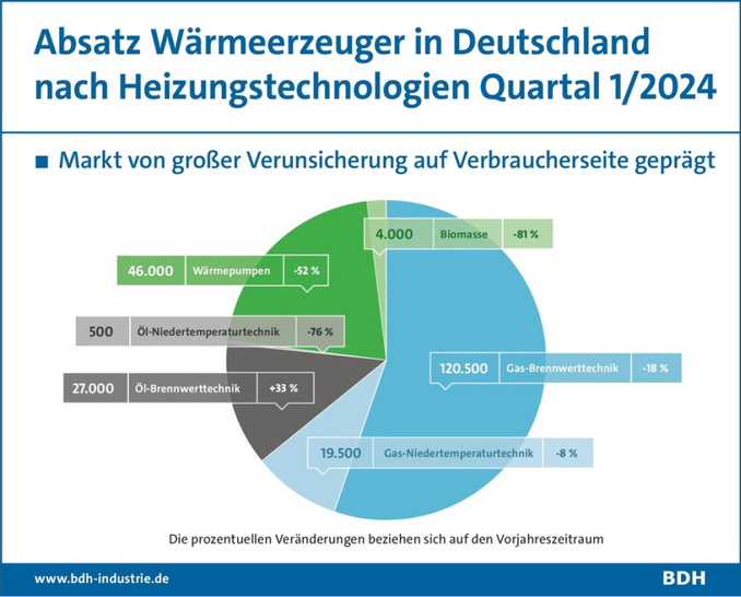Passend zur Einschätzung des Bundesverbands Wärmepumpe melden die Heizungshersteller für den deutschen Markt eine deutliche Eintrübung für Wärmeerzeuger. Der Absatz ist im 1. Quartal 2024 gegenüber dem Vorjahreszeitraum um 29 % gesunken. Laut den vom Bundesverband der Deutschen Heizungsindustrie (BDH) am 2. Mai 2024 vorgelegten Zahlen, gab es im 1. Quartal 2024 den größten Absatzeinbruch bei Wärmepumpen mit einem Minus von 52 %. Das entspricht 46.000 Geräten in absoluten Zahlen. Im 1. Quartal Jahres 2023 hatten die Hersteller noch 96.500 Wärmepumpen abgesetzt. Für Q1-2023 hatte der BDH ein Wachstum von 38 % auf 306.500 verkaufte Wärmeerzeuger und bei Wärmepumpen ein Plus von 111 %, bei Gas-Heizungen ein Plus von 14 %, bei Öl-Heizungen von 100 % und bei Biomasse-Heizungen von 7 % mitgeteilt.
