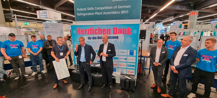 Das Team Funke aus dem niedersächsischen Twistringen gewinnt den zum ersten Mal vom Bundesinnungsverband (BIV) ausgelobten Ausbildungspreis, der künftig alle zwei Jahre auf der Chillventa vorbildliche Ausbildungsleistungen honorieren soll. Der Mix aus vielen Maßnahmen bei der Anwerbung und Begleitung der Auszubildenden war das mitentscheidende Kriterium. Ein Ausbildungsquote von ca. 18 Prozent, eine intensive Einarbeitung mit einer Grundausbildung, eine eigene Ausbildungswerkstatt mit zwei erfahrenen Rentnern als Azubi-Coach, interner Deutschunterricht für Auszubildende mit Sprachschwierigkeiten, viele Azubi-Events und ein Azubimobil sind nur einige Beispiele für das vielfältige Engagement des Team Funke.
