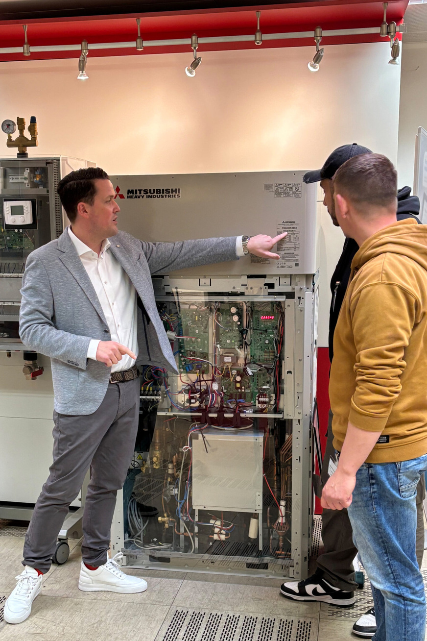 Die Schulungen kombinieren theoretische Inhalte mit praktischen Übungen. In den Schulungsräumen sind dafür Kälte- und Klimasysteme installiert, an denen die Teilnehmer arbeiten können. Unter anderem steht ein KXZE3-System von Mitsubishi Heavy Industries mit dem Kältemittel R32 zur Verfügung, um Aufgabenstellungen aus dem Betriebsalltag zu simulieren.