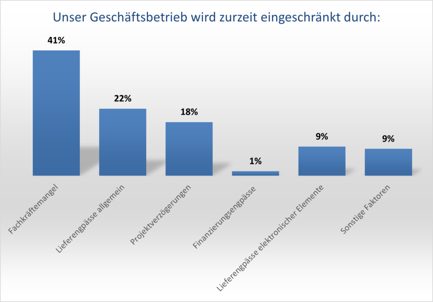 Über 40 % der Betriebe sehen den Fachkräftemangel als Hauptgrund für Einschränkungen im Geschäftsbetrieb. Zudem werden auch Lieferengpässe von Anlagen und Komponenten als wichtige Gründe angeführt. Dies betrifft auch das Geschäft mit Wärmepumpen.