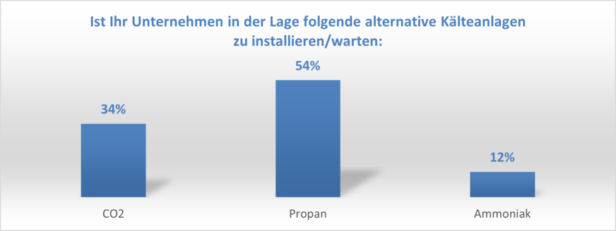 55 % der Fachbetriebe beziehen weniger als 1 t Kältemittel im Jahr, 35 % zwischen 1 t und 5 t Kältemittel und rund 10 % mehr als 5 t Kältemittel pro Jahr. Die Preise für Kältemittel mit hohem Treibhauseffekt sind im Vergleich zum Vorjahr weiter gestiegen – ein Trend, der sich sicherlich fortsetzen wird. Die Preise für F-Gas-freie und Niedrig-GWP-Kältemittel sind nahezu konstant geblieben. In diesem Zusammenhang ist zu erwähnen, dass 12 % der Teilnehmer angaben, dass es Lieferschwierigkeiten für manche Kältemittel gab, z.B. für R404A als aufbereitetes Kältemittel. Die Fachbetriebe rüsten sich bereits für eine Zeit, in der F-Gase als Kältemittel nur noch eingeschränkt zur Verfügung stehen werden. 63 % der Betriebe berücksichtigen bereits jetzt schon die Auswirkungen der noch in der Novellierung befindlichen F-Gase-Verordnung und der REACH-Verordnung bei der Systemauswahl für Kunden. Viele Betriebe müssen hierfür allerdings noch das Know-how im Umgang mit alternativen Kältemitteln aufbauen. Erst 54 % der Fachbetriebe sehen sich in der Lage, Propananlagen warten und installieren zu können, bei CO2-Anlagen sind es 34 % und bei Ammoniak-Anlagen nur 12 %.