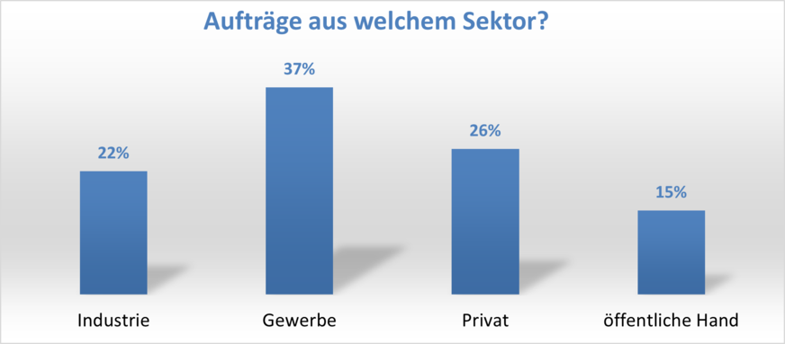 Der Auftragsbestand in Wochen ist ein früher Indikator für die künftigen Umsätze eines Unternehmens. Im Vergleich zur vergangenen Konjunkturumfrage ist dieser im Durchschnitt von 11 auf 15 Wochen gestiegen. Die Aufträge kommen dabei größtenteils aus dem Gewerbe (37 %), gefolgt vom wachsenden Markt der Privatkunden (26 %, Vorjahr 16 %), der Industrie (22 %) und der öffentlichen Hand (15 %). Rund 44 % der Befragten installieren bereits Hauswärmepumpen und 22 % haben dies zumindest in der Planung. In 16 % der Betriebe bildet das Wärmepumpengeschäft sogar den Schwerpunkt der Geschäftstätigkeit – ein deutlicher Anstieg im Vergleich zum Vorjahr. Der Schwerpunkt liegt jedoch bei den meisten Betrieben nach wie vor in der Installation und Wartung von Klimaanlagen (25 %), gefolgt von Gewerbekälteanlagen bei 20 % der Betriebe.