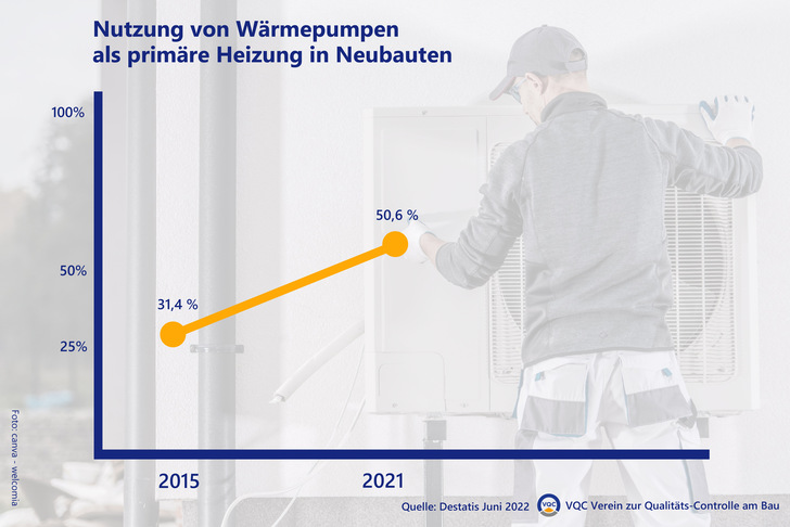 Meist handelt es sich um Wärmepumpen: Sie kommen in 50,6 % der Neubauten als primäre Heizung zum Einsatz. Zum Vergleich: 2015 waren es noch 31,4 %. Der Verein zur Qualitäts-Controlle am Bau e.V. (Göttingen) weist darauf hin, dass bei diesen neuen Heiztechnologien eine besonders sorgfältige Bauausführung des Neubaus nötig sei, da ansonsten die Heizleistung in manchen Situationen nicht ausreichen könne.