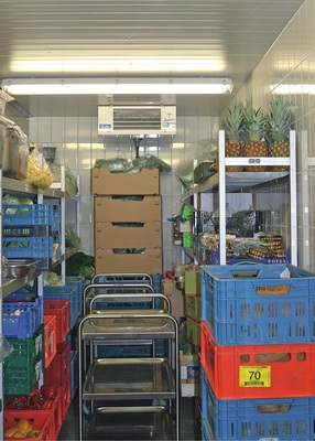 Insgesamt gibt es im Zuffenhausener Neubau vierzehn Kühl- und zwei Tiefkühlräume. In den unteren Etagen, fernab der Augen der Museumsbesucher, werden Milchprodukte, Gemüse, Fleisch, Fisch, Wein und sonstige Lebensmittel gelagert und tiefgekühlt. Aber auch hier galt es, Herausforderungen zu meistern. Vor allem der Fleischreiferaum hatte ganz besondere Anforderungen. Der Raum zur Lagerung und Reifung von Rindfleisch benötigt neben Kühlung auch eine adäquate Be- beziehungsweise Entfeuchtung. Neben der richtigen Temperatur ist eine konstante Luftfeuchtigkeit von großer Wichtigkeit. Nur so reift das Fleisch, wird mürbe und trocknet dabei weder aus noch verliert es seinen Eigengeschmack.