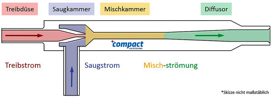 Der größere Eingang ist für den Treibstrom – dieser ist nach dem Gaskühler angeordnet. Der kleinere Eingang ist der des Saugstroms. Er kommt von einem Akkumulator oder auch Flüssigkeitsabscheider genannt. Der Ausgang geht in den Mitteldruckbehälter, also dem Sammler. Innerhalb des *c-Ejector Innen befinden sich keine beweglichen Bauteile. Es gibt eine Treibdüse, eine Saugkammer, eine Mischkammer und den Diffusor am Ausgang des Ejektors. Der hohe Druck auf der Hochdruckseite drückt das Fluid durch die Treibdüse und beschleunigt das Kältemittel sehr stark. Durch die Entspannung im Austritt der Düse fällt der statische Druck unter den Saugdruck der Normalkühlstufe. Der hier in der Saugkammer entstandene Unterdruck saugt das CO2 aus dem Akkumulator ab. In der Mischklammer vermischt es sich zu einem gemeinsamen Massenstrom und wird im Diffusor, am Ausgang des *c-Ejektors, wieder entschleunigt, wodurch der Druck auf Mitteldruckniveau ansteigt. Der Ejektor ersetzt somit das Hochdruckventil, mit dem Unterschied, dass ein zusätzlicher Massenstrom beigefügt wird.