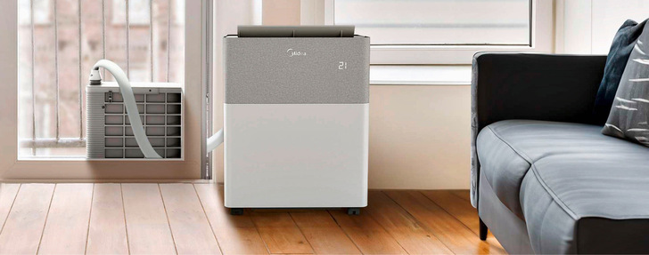 Mit dem PortaSplit bietet Midea ein mobiles Split-Klimagerät, das die Funktionen Kühlen, Heizen, Entfeuchten und Ventilieren in einem Gerät vereint. Es ist für Räume bis zu einer Größe von 42 m² oder 105 m³ konzipiert und erreicht eine Kühlleistung von 3,5 kW sowie eine Heizleistung von 3,5 kW mittels Wärmepumpentechnologie. Die Energieeffizienz wird für den Kühlbetrieb mit der Klasse A++ (SEER 6,1) und für den Heizbetrieb mit der Klasse A+ (SCOP 4,0) angegeben. Ein Inverter-Motor sowie ein KI-Algorithmus zur Anpassung an Temperaturschwankungen sollen den Energieverbrauch regeln. Die Installation kann ohne Techniker erfolgen, wobei Innen- und Außengerät über einen 2,7 cm flachen Kältemittelschlauch verbunden werden, der für verschiedene Fenstertypen geeignet ist. Ein verstellbarer Deflektor sorgt für die Luftstromverteilung im Raum. Im Silent-Modus beträgt der Schalldruckpegel 39 dB(A). Die Steuerung ist per Fernbedienung oder App möglich.