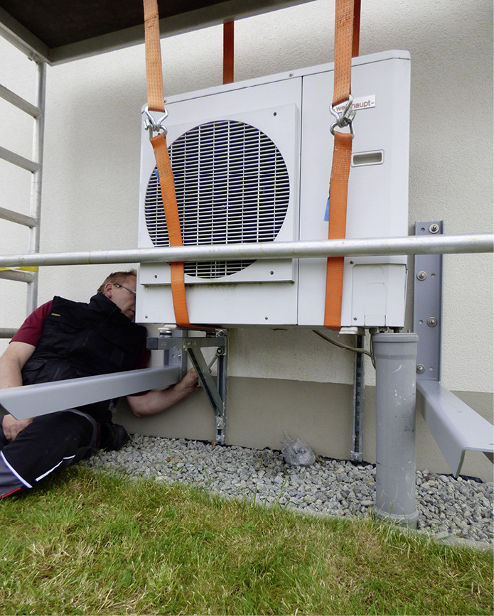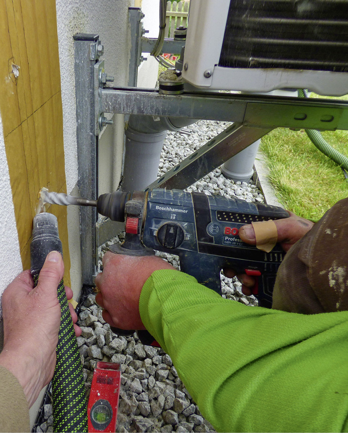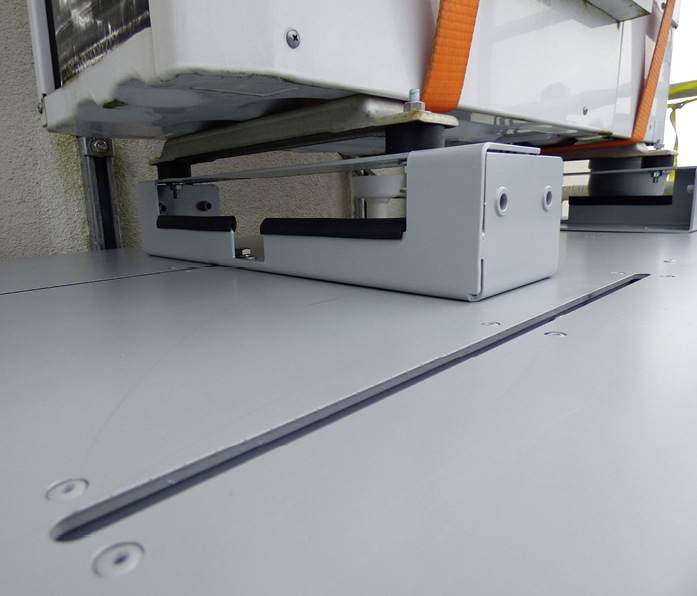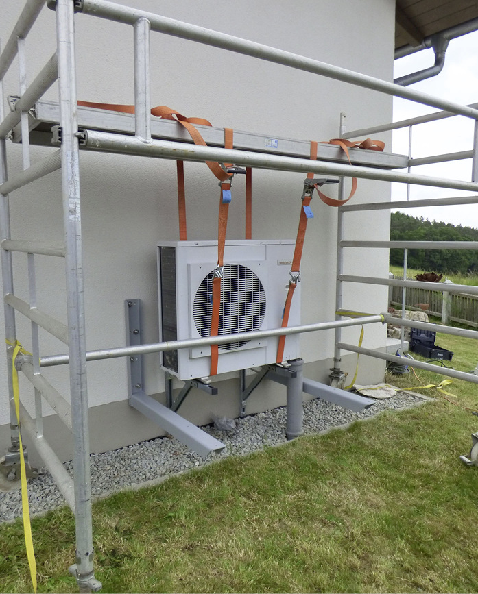 Ein Gerüst wurde um das Gerät errichtet, damit die Wärmepumpe mit Spanngurten abgefangen und etwas gehoben werden konnte (Bild 4). So war es möglich, die alten Träger unter der Wärmepumpe im laufenden Betrieb zu demontieren (Bild 5) und die neue Wandkonsole zu befestigen. Auf diese Konsolen legte man die Trägerplatte für die Schallhaube jedoch nur so weit, dass ein Ausschnitt für die bestehende Versorgungsleitung von unten angezeichnet werden konnten.