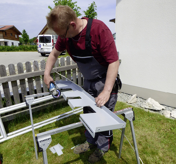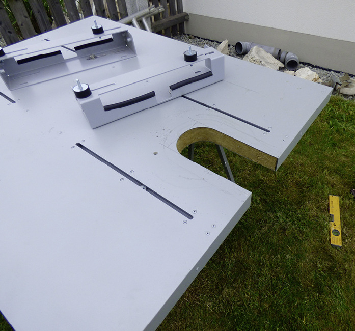 Mit einer Stichsäge wurde der Ausschnitt auf dem Arbeitstisch hergestellt (Bild 6) und mit einem Kantenschutz versehen (Bild 7). Danach konnte die Basisplatte auf den Trägerprofilen aufgelegt, in die Endposition geschoben und mit M8 - Schrauben fixiert werden.