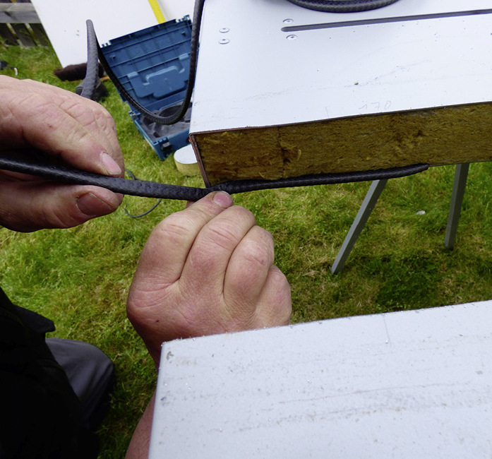 Im nächsten Schritt waren selbstklebende Filzstreifen auf Maß zu schneiden und an den Stützblechen der Seitenwände anzubringen (Bild 11). Das ist besonders wichtig, denn auf diese Weise wird der hintere Luftansaugbereich vom vorderen Luftaustrittsbereich getrennt. In diesem Sinne wurde auch der Zwischenraum zwischen Wärmepumpengehäusedeckel und Schallhaubendeckel mit Dämmstreifen ausgefüllt. Danach wurde der Kondensatablauf mithilfe eines Kreisbohrers von unten in die Bodenplatte gestanzt und angeschlossen.