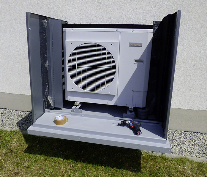 Als 2019 ein Neubau auf der anderen Straßenseite errichtet und bezogen wurde, stellten sich die Geräusche als Störfaktor heraus. Je nach Leistungsstufe der Wärmepumpe und Windrichtung störten die Brummgeräusche der Luft-/Wasser-Wärmepumpe WWP L 7 AERS von Weishaupt mit einem Schallpegel von 68 dB(A) teilweise massiv. Die jahrelange Suche nach alternativen Lösungen war mithilfe des ortsansässigen Heizungsbauers Ulrich Prommersberger endlich erfolgreich. Dieser stieß in einer Fachzeitschrift auf die Schallschutzhaube eSilent HT von Atec.