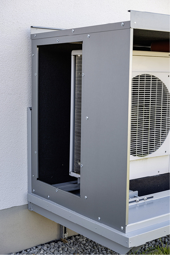 In die beiden Fenster der Seitenwände waren die Zuluftkulissen einzubauen (Bild 12). Diese dienen später dem schnellen Zugriff: Servicearbeiten am hinteren Wärmeübertrager und am Elektroanschluss der Wärmepumpe können somit einfacher ausgeführt werden. Zu guter Letzt wurde das Dach der Schallschutzhaube aufgelegt und mit Innensechskantschrauben M8 x 20 an den Seitenwänden befestigt (Bild 13).