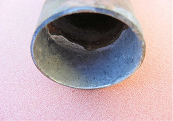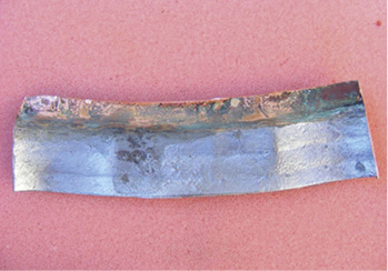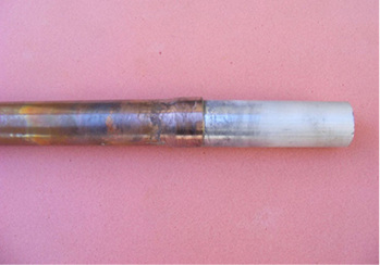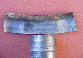 Die Lötprobe sowie die Ergebnisse der Schälprüfung zeigen die Bilder 7 bis 10 . Die Flussmittelreste wurden nach dem Löten mit einer Bürste entfernt. Nach dem Kürzen des Kupferrohres wurde das Aluminiumrohr gespannt und ein Anschnitt im Bereich des Kupferrohres ausgeführt, bevor dieses mit einer Zange vom Aluminiumrohr geschält werden konnte ( Bild 8 ).