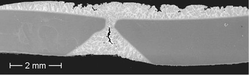 Allgemein dienen die metallographischen Untersuchungen zur Abschätzung der zu erwartenden inneren Unregelmäßigkeiten sowie der sich einstellenden Spaltbreiten. Der in Bild 13 dargestellte Makroschliff zeigt eine im Ofen gelötete Aluminiumfügeverbindung unter Verwendung des Sonderweichlotes S-ZnAl 25-430 / 450. Die Unregelmäßigkeiten und die Spaltbreite können gut bewertet werden.