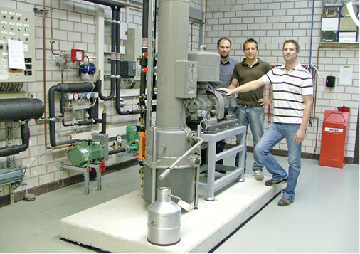 Das Jahr 2014 stand dann in vielerlei Hinsicht im Zeichen natürlicher Kältemittel. Nicht nur auf der internationalen Fachmesse Chillventa im Oktober waren sie ein großes Thema, sondern auch an der ESaK befasste man sich damit. So war ein Höhepunkt dieses Jahres die Inbetriebnahme einer fast hundertjährigen historischen Kältemaschine, bekannt unter dem Namen Rot-Silber-Kühlautomat“ oder Audiffren-Singrün-Maschine“. Ursprünglich sollte sie für die Erklärung der Funktion nur als Schnittmodell aufbereitet werden. Doch die Studenten wurden vom Ehrgeiz gepackt und begannen die Inbetriebnahme der gesamten Maschine. Der über 90 Jahre alte Kühlautomat läuft heute noch mit der ersten Kältemittel- und Ölfüllung auf natürlicher Basis und konnte bereits auf der Chillventa 2014 und der ISH 2015 bestaunt werden.