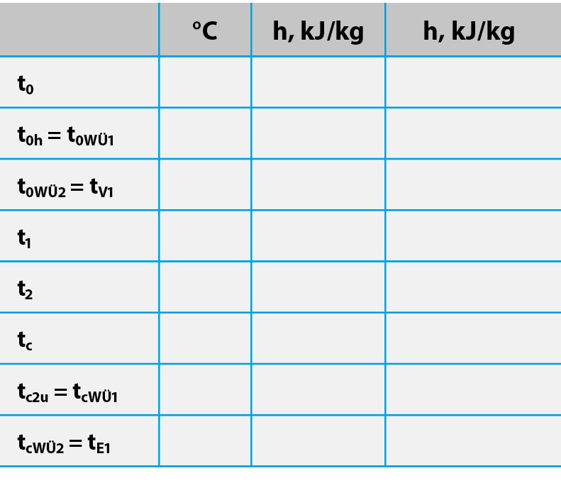 Frage 5:Tragen Sie den Prozess ins lg p,h-Diagramm ein und ermitteln Sie t2, x, v1 sowie die erforderlichen h-Werte, die Sie dann in die Spalte 3 der Tabelle eintragen.