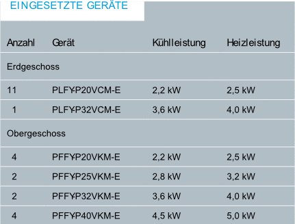 Nach Auswahl der Technologie musste der passende Anbieter dieser Systeme gefunden werden. Nach Information auf einer Fachmesse und Gerätebemusterung vor Ort, entschied man sich für die City Multi VRF-Serie von Mitsubishi Electric. Bei diesen Anlagen ist auch der Aufstellungsort des benötigten Außengerätes sehr variabel wählbar, da bis zu 1000m Gesamtrohrleitungslänge möglich sind.
