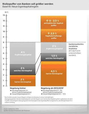 Basel III, dessen Regeln schrittweise von 2013 bis 2019 eingeführt werden sollen, bedeutet noch strengere Vorschriften für das Eigenkapital und die Liquidität der Banken. Ziel ist es, die Banken vor weiteren Krisen zu schützen. Die oben aufgeführte Grafik soll die Veränderungen von Basel II zu Basel III kurz und übersichtlich darstellen.