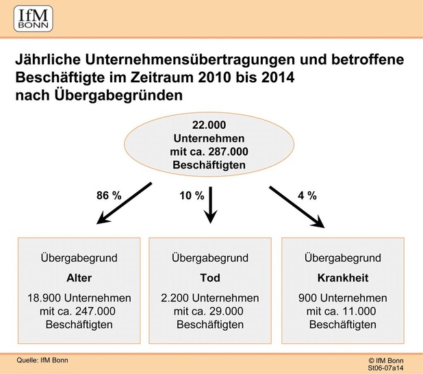 Nach einer Studie des Instituts für Mittelstandsforschung Bonn stehen bis zum Jahr 2014 jährlich ca. 22000 Familienunternehmen zur Nachfolge an und es werden pro Jahr ca. 287000 Beschäftigte davon betroffen sein. Ein Unternehmer, der das 55. Lebensjahr erreicht und immer noch nicht an die Nachfolge gedacht hat, bringt seine Unternehmung sukzessive in Schwierigkeiten. Beispiel: Die Unternehmung benötigt Kapital für eine dringende Investition, die nicht aufgeschoben werden kann. Sie gehen zur Bank und beantragen ein Darlehen. Als Erstes würde Sie der Banker fragen: Wer garantiert mir, dass Sie das Darlehen in Ihrem fortgeschrittenen Alter auch noch zurückzahlen können? Sorgen Sie rechtzeitig vor!