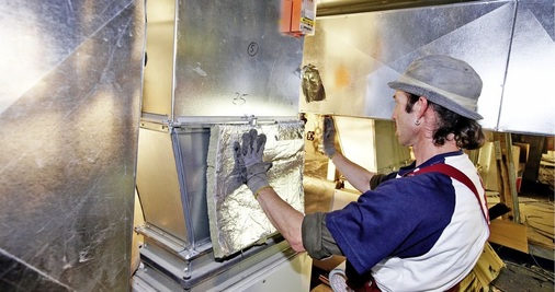 In beiden Fällen kam die Klimarock- Dämmmatte von Rockwool in einer Dicke von 30 mm zum Einsatz. Bei den Blechkanälen war die Sache einfach und für uns Routine: Nach der Reinigung der Kanaloberfläche wurden die ,Klimarock-Matten nach Maß zugeschnitten, um die Kanäle gewickelt und an den Längs- und Rundstößen mit Rockwool ,Alufix-Klebeband dicht verklebt. Danach erfolgte die mechanische Befestigung über Schweißstifte. Bei Rundrohren wurde die Dämmung mit ca. acht Windungen Wickeldraht pro laufendem Meter gesichert. Bei den Betonkanälen mit großen Querschnitten haben wir zunächst an einigen Stellen den Einsatz eines Sprühklebers erprobt. Mit Erfolg, so dass die ,Klimarock auf den Betonoberflächen vollflächig verklebt wurde. -