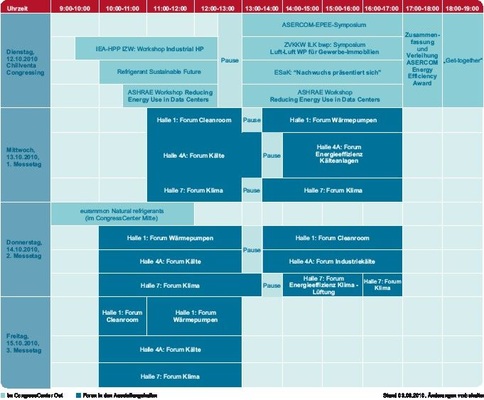 Das Fachprogramm Chillventa Congressing liefert parallel zur Messe umfangreiche und hochqualifizierte Informationen und spannt den Bogen über alle Segmente der Kälte-, Klima-, Raumluft- und Wärmepumpen-Branche. Es werden insgesamt mehr als 130 Vorträge angeboten. Chillventa Congressing beginnt schon am Vortag der Messe, Dienstag, den 12. Oktober, und bietet den Fachbesuchern vielfältige Informationen in Form von Workshops, Vorträgen und Symposien. Darüber hinaus gibt es die Möglichkeit, sich in Fachforen zu den Themen Kälte, Klima, Lüftung, Wärmepumpen und Cleanroom umfangreich zu informieren. Neben diesen Foren umfasst das Fachangebot auch das neue Cleanroom Village (Halle 1) und das Industrial Heat Pump Village (Halle 1).