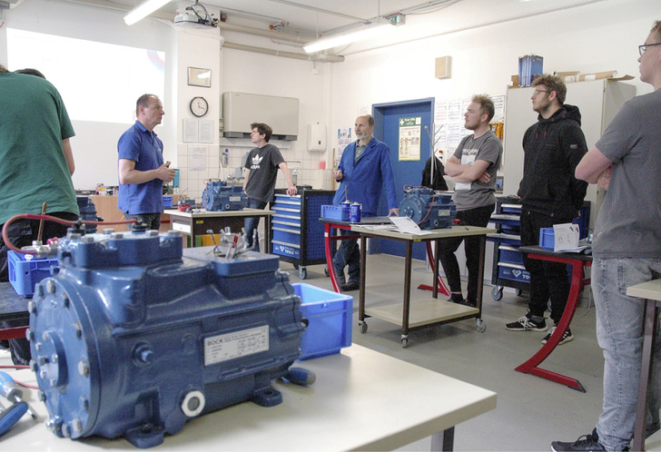 Schrauben-, Drehmoment- und Innensechskantschlüssel, Schraubendreher sowie weitere Werkzeuge liegen zu Unterrichtsbeginn am 23. Mai an den neu eingerichteten Arbeitsplätzen zur Verdichtermontage des Beruflichen Schulzentrums Vogtland, Schulteil Reichenbach griffbereit. Mehrere Hubkolbenverdichter stehen noch komplett zusammengebaut auf den Werkbänken. Davor verfolgen die Auszubildenden des dritten Lehrjahres in der dualen Ausbildung zum Mechatroniker für Kältetechnik konzentriert die Arbeitsanweisungen und Hinweise von Frank Alisch, Schulungsleiter am Trainingszentrum für Verdichtertechnik des Unternehmens Danfoss BOCK in Frickenhausen, sowie von Marvin Hamori und Ingolf Heinemann, beide Fachlehrer für Kältetechnik am BSZ Vogtland.