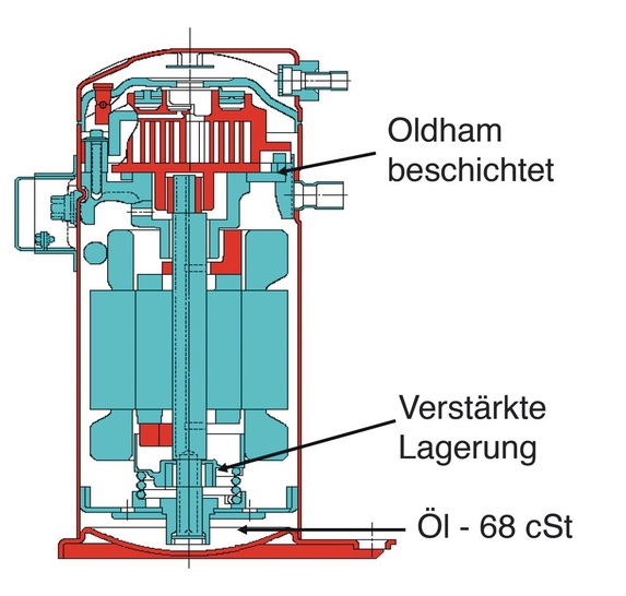 In Supermarktkälteanlagen werden beide Anwendungen in Kombination benötigt. Bei der Entwicklung der subkritischen CO 2 -Lösung konnte bei Copeland davon ausgegangen werden, dass man bereits über Verdichter für R410A verfügt, die für Drücke bis 43bar geeignet sind. Damit kann man beim Saugdruck von 27 bar die TK-Stufe realisieren und hat für deren Kondensation den günstigen Wert von ca. 5°C, was mit der einige K darunterliegenden NK-Verdampfungstemperatur gut korrespondiert. Die konstruktive Anpassung des TK-Verdichters bezieht sich auf die Verschleißreduzierung durch verstärkte Wellenlagerung und beschichtete Oldham-Kupplung. Zudem ist zur besseren Überwachung ein Ölschauglas vorhanden und die Ölviskosität ist höher als bei der Klimaanwendung gewählt.