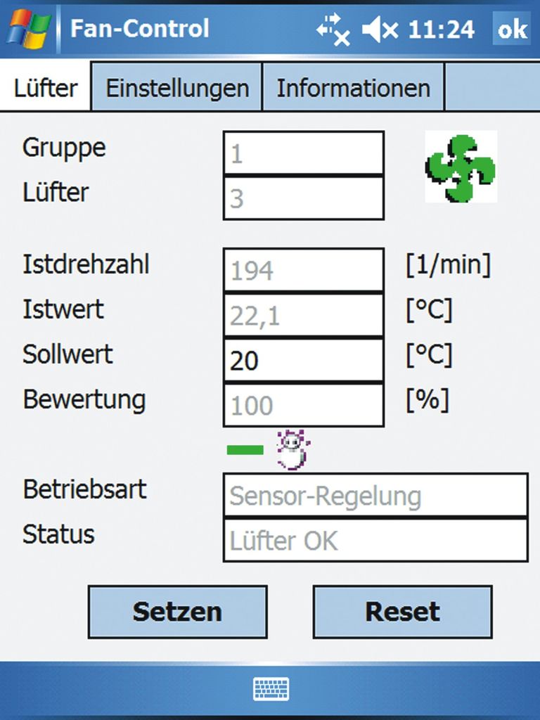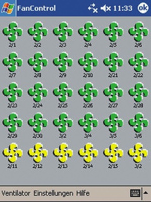 Die Steuerungssoftware Fan Control 3.0 läuft auf PDAs und Smartphones, die mit dem Betriebssystem Windows Mobile 2003 oder höher arbeiten. Sie ist intuitiv zu bedienen, so dass sich Einstellungs- und Diagnosearbeiten bei bis zu 255 Lüftergruppen mit maximal je 30 Ventilatoren sehr einfach durchführen lassen. Bereits der Hauptbildschirm stellt übersichtlich die wichtigsten Informationen zur Verfügung. Nach dem Anmelden werden die Ventilatoren-Icons der gewählten Gruppe auf dem Bildschirm eingeblendet. Die Software sucht automatisch alle am Bus installieren Ventilatoren und blendet sie in der Reihenfolge ein, in der sie gefunden werden (Bild 3). Unter dem jeweiligen Symbol erscheint die Geräteadresse. Die Farbe des Icons gibt Aufschluss über den aktuellen Betriebszustand. Grün steht für einwandfreie Funktion, gelb zeigt ein Kommunikationsproblem und ein rotes Symbol signalisiert, dass bei diesem Ventilator ein Fehlerzustand erkannt wurde.