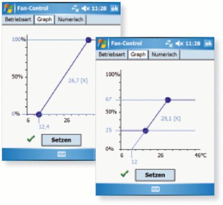 Ventilatoreinstellungen lassen sich aber nicht nur per PDA abrufen, sondern auch verändern. Man kann also z.B. für einen Ventilator eine andere Netzwerkadresse vergeben, zwischen verschiedenen Betriebsarten umschalten (Drehzahlregelung, PWM-Steuerung, Sensorregelung) oder die eingestellten Sollwerte anpassen, beispielsweise für Drehzahl oder Drehrichtung (Bild 4). Das ist entweder mit numerischen Eingaben möglich, oder man kann dabei mit anschaulichen, grafischen Darstellungen arbeiten (Bild 5) und dann einfach am Bildschirm die farbig markierten Sollwertpunkte oder die Grenzwert-Linien entsprechend verschieben. Die Software wird in zahlreichen Sprachen angeboten und ist somit weltweit einsetzbar.