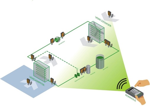 Eine besondere Innovation zeigte die holländische Firma Panimpex: Eine elektronische Manometerbatterie ohne Schläuche und ohne Kabel. Die Monteurhilfe, die unter der Markte Metreco vertrieben wird, empfängt die Messwerte der Druck- und Temperatursensoren per Funk ein Gerät kann bis zu zehn Sensoren auswerten. Der Monteur kann sich mit dem Handgerät nicht nur frei bewegen, sondern auch an größeren Anlagen die Messwerte selbst von entlegeneren Ecken (z. B. von Anlagenteilen auf dem Dach) gleichzeitig empfangen und auswerten. Gibt es Abweichungen zu den hinterlegten Sollwerten, macht das integrierte Diagnoseprogramm zudem entsprechende Aktionsvorschläge. Das Gerät ist über einen kapazitiven Bildschirm einfach zu bedienen und kann sämtliche Messprotokolle speichern, um sie später auf einen PC herunterzuladen. Dazu wird die Konsole wie ein USB-Stick ohne zusätzliche Software einfach an den Rechner angeschlossen. Darüber hinaus können Kundendaten und Wartungsprotokolle gespeichert und ausgedruckt werden. Dabei ist es möglich, auch Daten in Bezug auf Druckproben, Vakuumproben, Lecksuche und Leckreparaturen, Kältemittel, Feuchtegrad, Säuregehalt und Ölqualität einzugeben und zu speichern. Kommt es doch einmal vor, dass der Monteur Kältemittel nachfüllen muss, wird ein geeigneter Satz Schläuche mitgeliefert, mit denen beim Füllen die Funksensoren weiter betrieben werden können. Handkonsole und Sensoren werden im Tragekoffer geliefert, der zugleich auch die Akku-Ladestation ist, und sowohl über das Stromnetz als auch über die Fahrzeugbatterie (12 V) die Akkus laden kann.