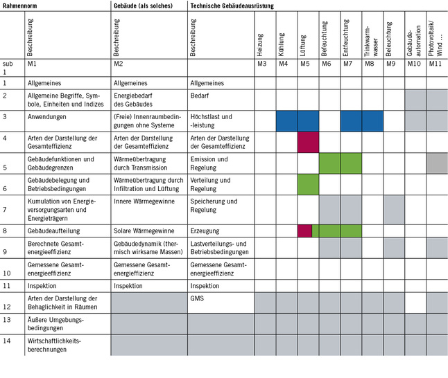 Die Zuordnung in der allgemeinen Matrix ist der Tabelle auf Seite 20 zu entnehmen. Die grau hinterlegten Felder haben keinen Bezug zur Norm, während die farbig hinterlegten Felder die Zuordnung in der Matrix dokumentieren.