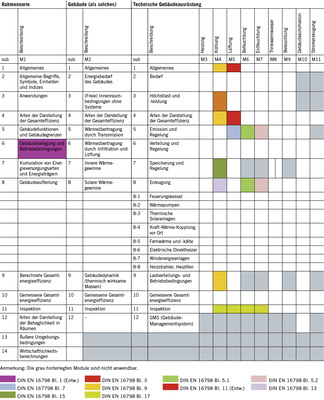 In Analogie zu anderen Normen zur energetischen Bewertung von Gebäuden (DIN EN 15613 [11], DIN EN 12831 [12], [13]) erfolgt eine Zuordnung der jeweiligen Blätter nach der normativ festgelegten Matrix (Tabelle 2). Die Modulbezeichnung verweist zuerst auf die Zuordnung der Spalten und mit Bindestrich auf die entsprechende Beschreibung.