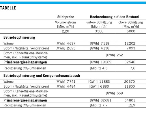 Die Hochrechnung ergibt bei konsequenterUmsetzung empfohlener Maßnahmen im ge-samten Anlagenbestand ein maximales Energieeinsparpotenzial von 11,9 bis 20,4 TWhWärme und 7,5 bis 12,5 TWh Strom. Umgerechnet entspricht dies Primärenergieeinsparungen von 32,7 bis 54,6 TWh und damit einer Reduktion der CO 2 -Emissionen von umgerechnet 7,7 bis 12,9 Mio. Tonnen (Bild 1).