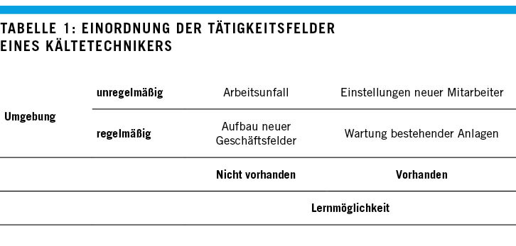 Wartung und Instandhaltung stellen eine regelmäßige Umgebung dar. Die Erweiterung desGeschäftsfeldes, die Installation bisher nicht eingesetzter Lösungen ist dagegen ungewohnt. Kältetechniker erleben eine solche Situation meistens erst nach einigen Jahren erneut. Weiterhin kann der Lerneffekt gering sein, wenn in der Kältetechnik Erfahrungen vorliegen, aber in der Klimatechnik bisher nur wenige. Dann gilt es, sich externen Rat zu holen, die Aufgabe durch einen unabhängigen Experten begleiten zu lassen. Dabei kann und darf durchaus befragt werden, welches Wissen wie eingesetzt, welche Erfahrung wie gewonnen wurde.