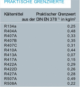 Der praktische Grenzwert wird daher herangezogen, um zu berechnen, welche Kältemittelmenge maximal in einen Personenaufenthaltsbereich gelangen darf, ohne dass Personen gefährdet werden.