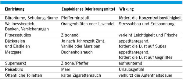 Die zugesetzten Stoffe sollten dabei nicht einfach stark riechen, sondern im Falle einer Leckage den anwesenden Personen ein eher positives Gefühl vermitteln. So wurden zahlreiche Zusätze für verschiedene Einsatzbereiche getestet und ein ganzes Programm von Duftstoffen entwickelt. Dazu einige Beipiele: