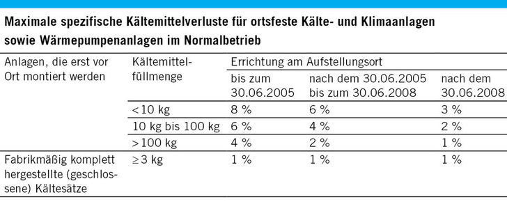 Ein Leckageerkennungssystem muss das Austreten fluorierter Treibhausgase aus Leckagen feststellen und den Betreiber in diesem Fall warnen. Zusätzlich sollte es in der Lage sein, die Einhaltung des spezifischen Kältemittelverlustes aus der ChemKlimaschutzV (siehe Tabelle) zu kontrollieren 1 . In einer Informationsbroschüre 2 der Europäischen Kommission heißt es hierzu:Bei der Wahl einer geeigneten Technik und eines angemessenen Installationsortesfür ein Leckageerkennungssystem muss der Betreiber alle Parameter mit Einfluss auf die Wirksamkeit berücksichtigen, damit das installierte System ein Leck auch wirklich erkennt und den Betreiber warnt.Zu solchen Parametern gehören u. a. die Art der Anlage, der Raum, in dem sie installiert wird, und ggf. die Gegenwart anderer Verunreinigungen in diesem Raum.Als Faustregel gilt: Sofern ein System zur Erkennung von Leckagen durch Überwachung des Vorhandenseins von F-Gasen in der Luft angemessen ist, sollte es