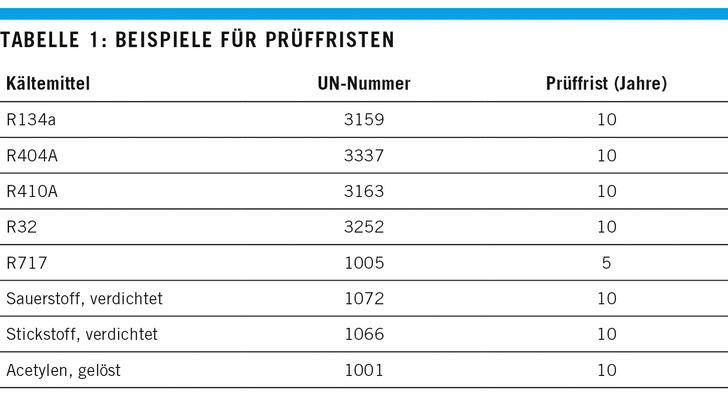 Die detaillierten Vorgaben zur Verwendung von Gasflaschen oder Flaschenbündeln sind in den Verpackungsvorschriften des Kapitels 4.1 zum ADR niedergelegt. In der dortigen Verpackungsanweisung P 200 werden für Flaschen, Großflaschen, Druckfässer und Flaschenbündel u. a. die Prüffristen und andere prüfungsrelevante Daten für die einzelnen Gase (Namentlich oder nach UN-Nummer) aufgelistet. Daraus ergeben sich in Abhängigkeit von der Art des Füllgases Prüffristen von 5 oder 10 Jahren (siehe Tabelle 1).