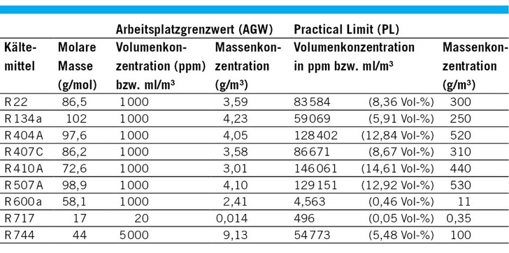 Da der Umgang mit der Formel nicht ganz einfach ist, beachten Sie die nachfolgende Tabelle mit den Umrechnungen für ein paar wichtige Kältemittel am Beispiel des Arbeitsplatzgrenzwertes (AGW) und desPractical Limit (PL), berechnet für 20 °C: